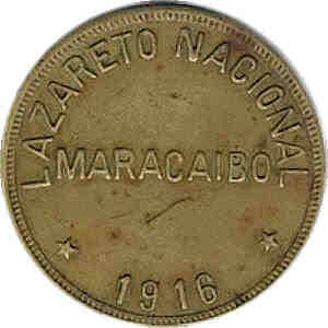 | Anverso | Grafila dentada. En forma circular la leyenda "Lazareto Nacional" y la fecha de la acu�aci�n, separada por estrellas de cinco puntas, en el medio de la moneda en una l�nea horizontal la palabra "Maracaibo" |