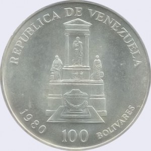| Reverso | Ribete circular sin gráfila. En el centro, sobre el campo, el sarcófago del Libertador Simón Bolívar que se encuentra en el Panteón Nacional en Caracas, circulado con la inscripciones: REPÚBLICA DE VENEZUELA en la parte superior y 1980 y 100 BOLÍVARES en la parte inferior. |