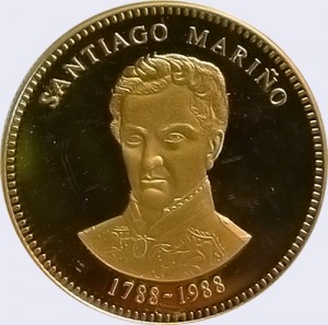 | Anverso | Ribete circular, gráfila dentada. En el centro, sobre el campo, efigie de Santiago Mariño (Martín Tovar y Tovar). A lo largo del borde, la leyenda SANTIAGO MARIÑO en la parte superior. En el exergo 1788-1988. |