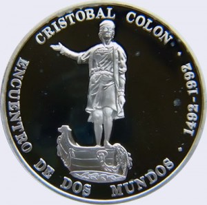 | Anverso | Ribete circular sin gráfila. En el centro, sobre el campo, imagen de Cristóbal Colón. A lo largo del borde, la leyenda CRISTOBAL COLON, ENCUENTRO DE DOS MUNDOS y 1492 - 1992. |