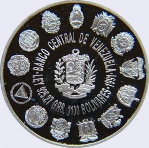 | Reverso | Ribete circular sin gráfila. En el centro, sobre el campo, Escudo Nacional circulada por las leyendas BANCO CENTRAL DE VENEZUELA, la pureza metálica LEY 925, el peso 27 GRS, el valor facial 1100 BOLIVARES y el año. A lo largo del borde, la leyenda Escudo Nacional de 13 países iberoamericanos participantes: Argentina, Bolivia, Brasil, Colombia, Cuba, Chile, España, México, Nicaragua, Perú, Portugal y Uruguay. |