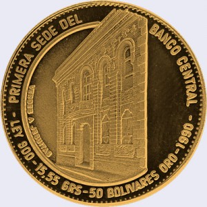 | Reverso | Ribete circular, gráfila dentada. En el centro, sobre el campo Fachada de la primera sede del Banco Central de Venezuela con la leyenda a su izquierda VEROES Y JESUITAS (dirección de la sede). A lo largo del borde, la leyenda PRIMERA SEDE DEL y BANCO CENTRAL en la parte superior, y en la parte inferior la pureza metálica LEY 900, el peso 15,55 GRS, el valor facial 50 BOLÍVARES ORO y 1990. |