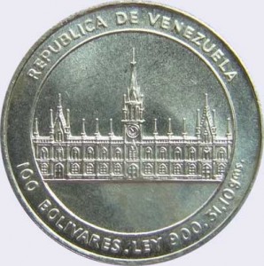| Reverso | Ribete circular sin gráfila. En el centro, sobre el campo, fachada de la antigua Universidad de Caracas dentro de un círculo concéntrico. A lo largo del borde, la leyenda REPUBLICA DE VENEZUELA en la parte superior; el valor facial 100 BOLIVARES la pureza metálica LEY 900 y el peso 31,10 gms en la parte inferior. |