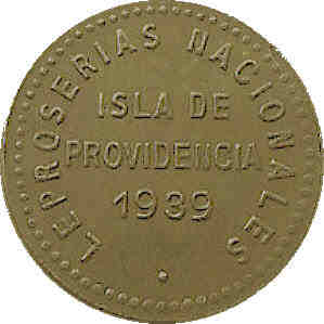 | Anverso | Grafila con puntos. En forma circular la leyenda Leproserías Nacionales y en tres (3) líneas horizontales: Isla de Providencia 1939 |