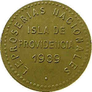 | Anverso | Grafila con puntos. En forma circular la leyenda Leproserías Nacionales y en tres (3) líneas horizontales: Isla de Providencia 1939 |