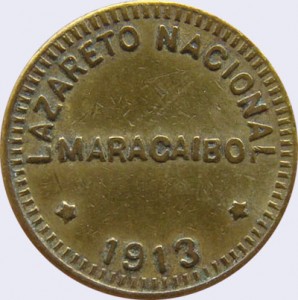 | Reverso | Ribete circular, gráfila dentada. En el centro, la inscripción Maracaibo junto con el año, circulada por LEPROSERIAS NACIONALES. |